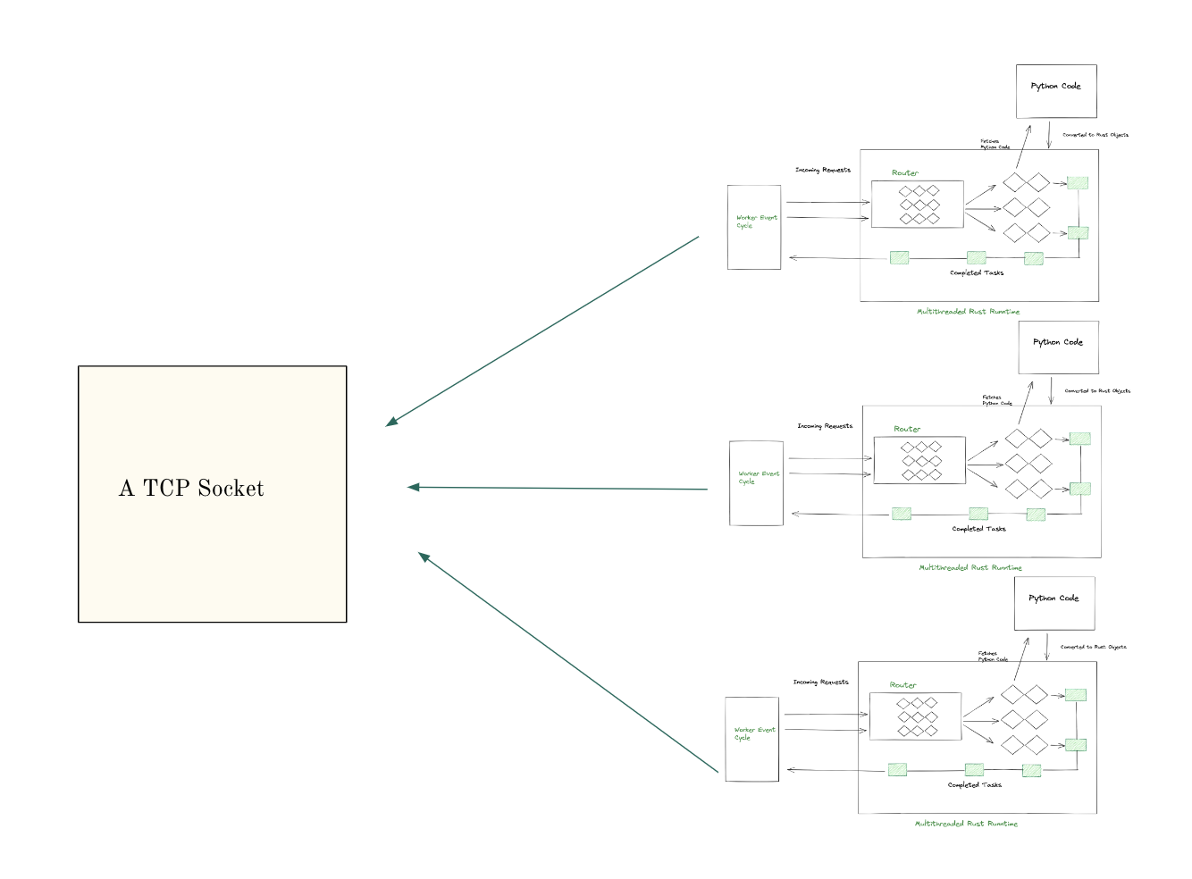 When the server is initiated with the python3 app.py command, Python code is dynamically transformed into Rust objects. Subsequently, the router gets populated. The architecture allows incoming requests to be matched against this router, and relevant Rust objects are queued for execution in the thread pool based on their types.